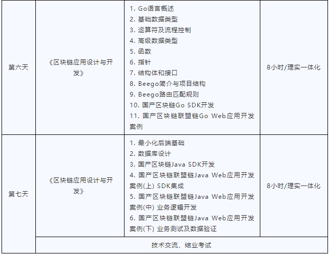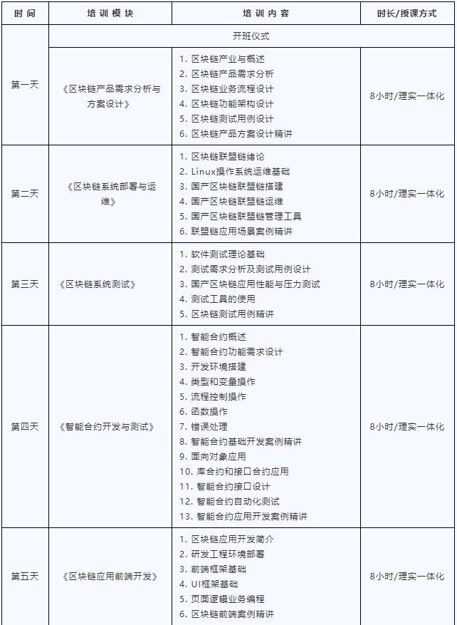 本次培训参照区块链技术应用专业要求以及区块链应用开发、智能合约开发、区块链测试、区块链运维等岗位需求,设置了区块链产品设计基础、区块链部署与运维、区块链测试、智能合约开发、区块链应用设计与开发五部分内容,核心技术有:区块链产品需求分析与方案设计、区块链系统部署与运维、区块链系统测试、智能合约开发与测试、区块链应用前端开发、区块链应用设计与开发等。