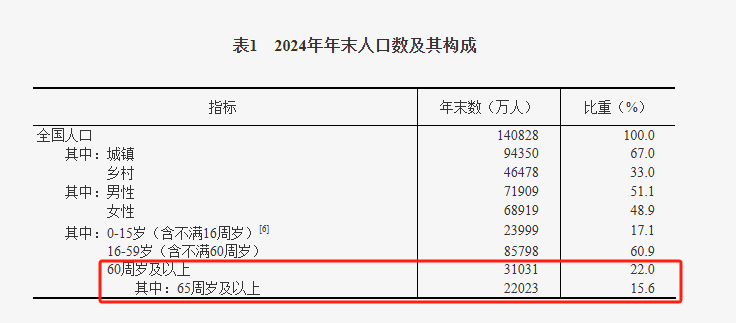 据国家统计局信息,截至2024年底,我国60周岁及以上老年人口达3.1亿,占总人口的22.0%。